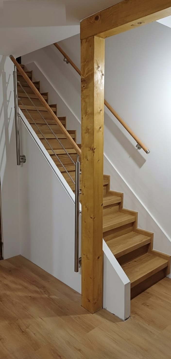 Jako doplněk nabízíme nerezový systém zábradlí. Pokud dáváte přednost přírodnímu materiálu před nerezovými madly, můžeme pro vás připravit dřevěná madla do mořená do barvy vaší vybrané podlahy nebo schodiště.