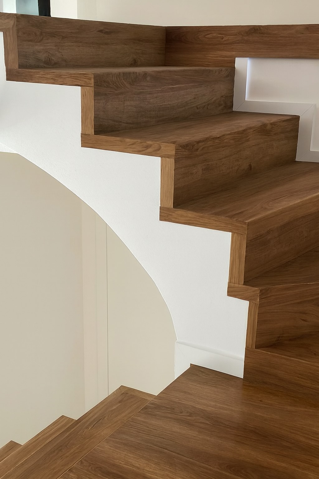 Pro schodnice SF nabízíme dva způsoby provedení podstupnic. Můžete zvolit podstupnice ve stejném dekoru jako schodnice, nebo využít elegantní kombinaci s bílou podstupnicí. Bílé podstupnice jsou barevně dokonale sladěny s našimi bílými soklovými lištami, což zajišťuje perfektní soulad bez odstínových rozdílů.
