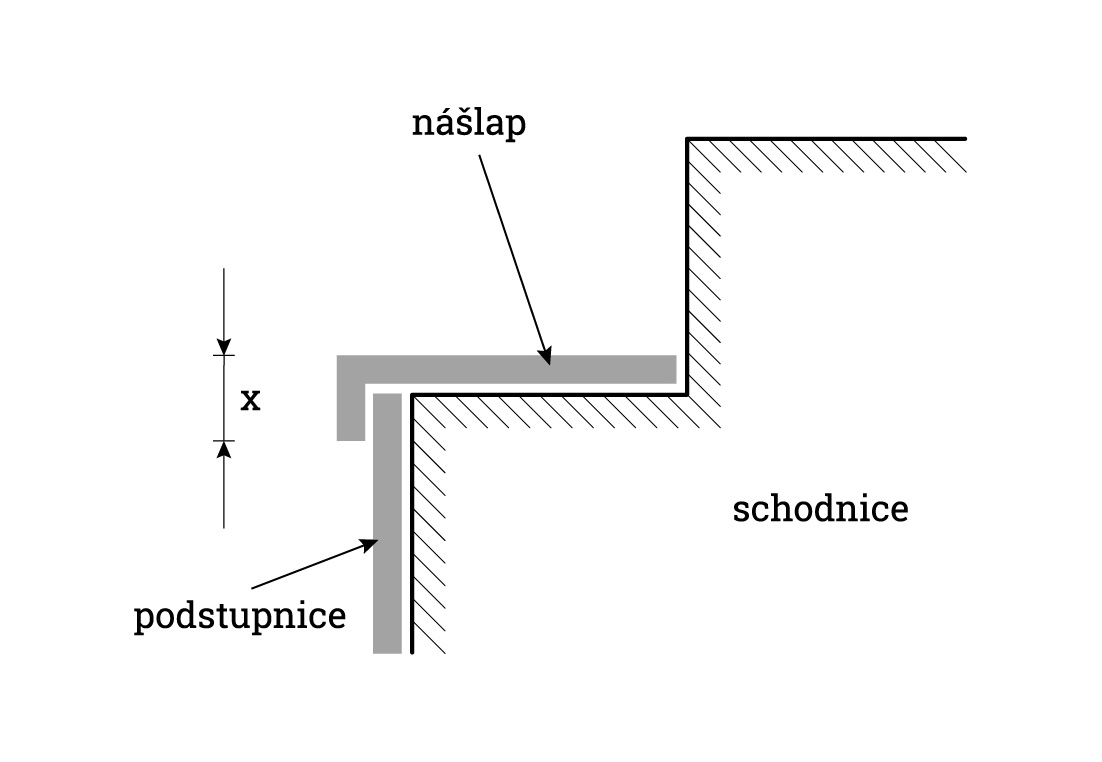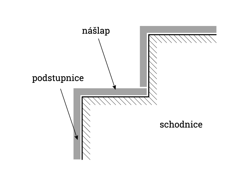 Elegantní řešení s jednoduchým L profilem a čistou linií schodu. Konstrukce neumožňuje zapuštění LED osvětlení do schodnice, osvětlení je proto nutné umístit mimo schodnici.
