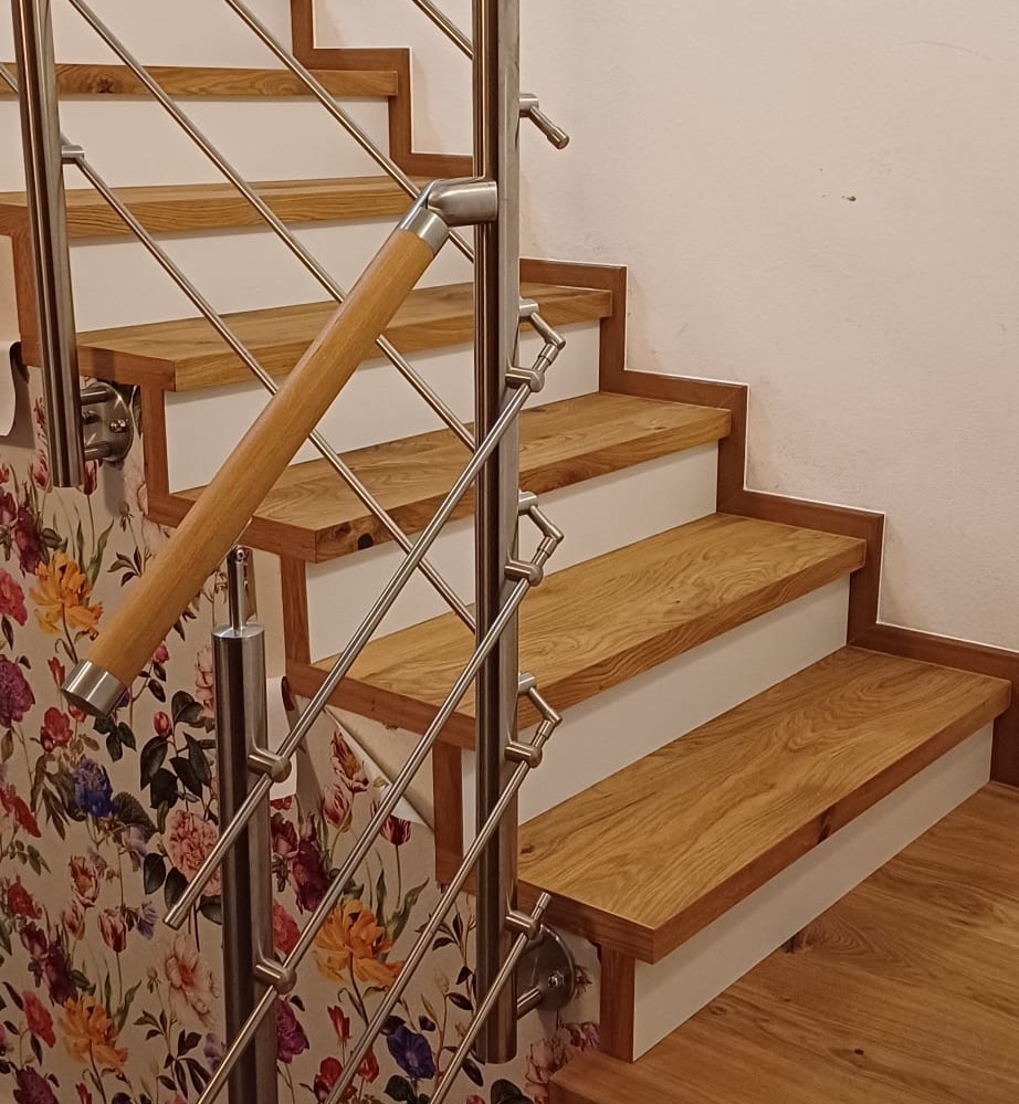 Jako doplněk nabízíme nerezový systém zábradlí. Pokud dáváte přednost přírodnímu materiálu před nerezovými madly, můžeme pro vás připravit dřevěná madla do mořená do barvy vaší vybrané podlahy nebo schodiště.